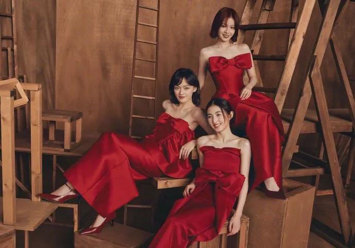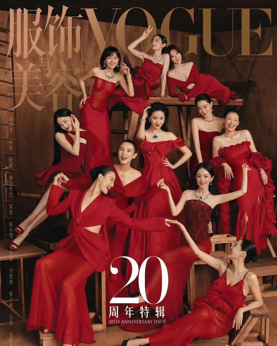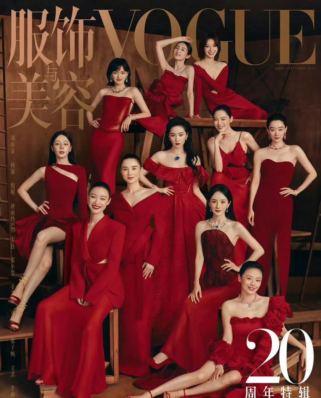 单人封面陆续出炉后,群像封面终于出炉。这一次11位女明星统一穿着制定的红色礼服,喜气洋洋,有点像过年,很是热闹。