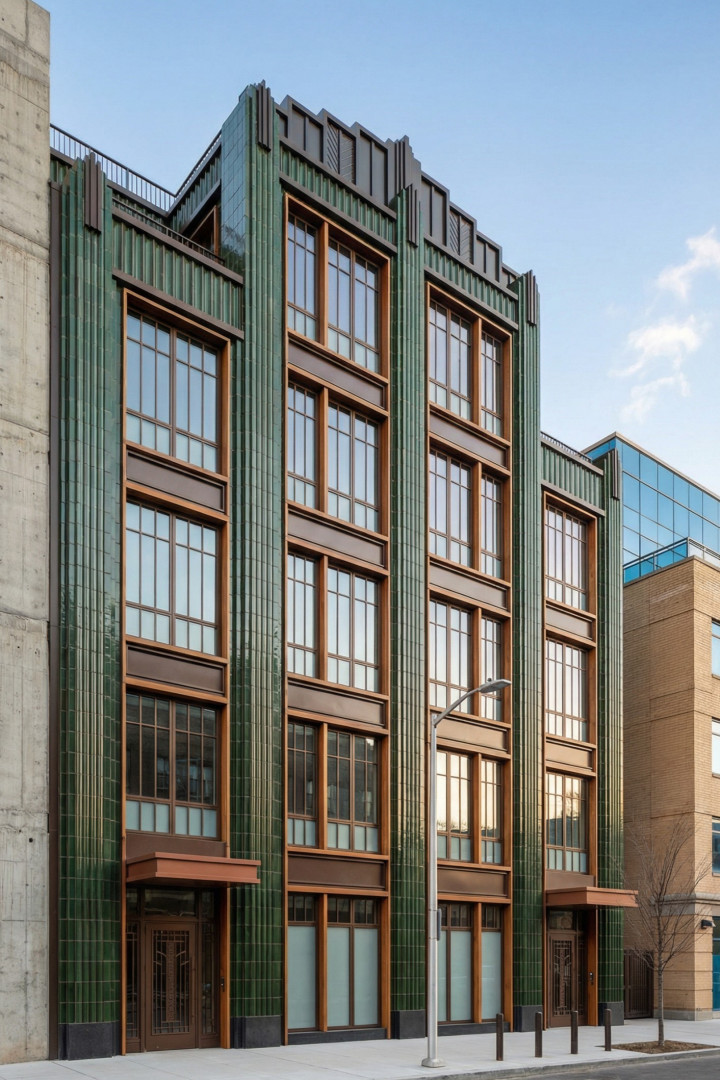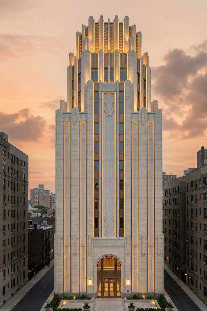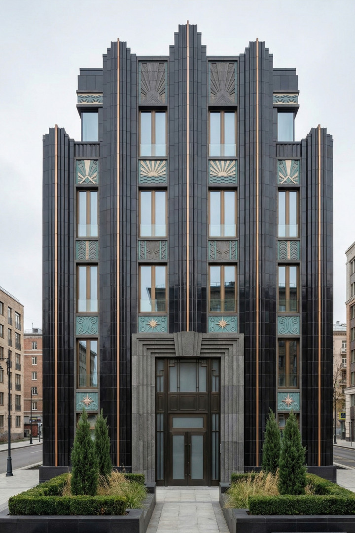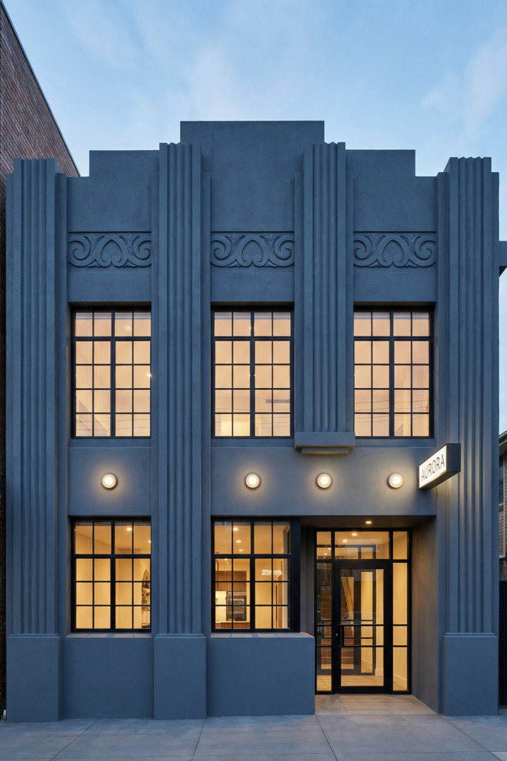 我们始终对经典装饰艺术风格在历经岁月的成熟与沉淀之后,融入现代街道与住宅的演变历程痴迷不已。这些建筑立面巧妙借鉴了20世纪30年代市政厅、电影院、远洋客轮以及天际线建筑的元素。然而,我们并未全盘接纳,而是摒弃了其中繁复的装饰,仅保留原有的韵律,进而让光影与反射成为视觉的核心焦点。