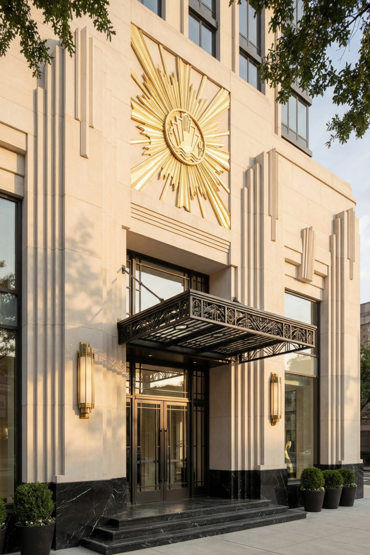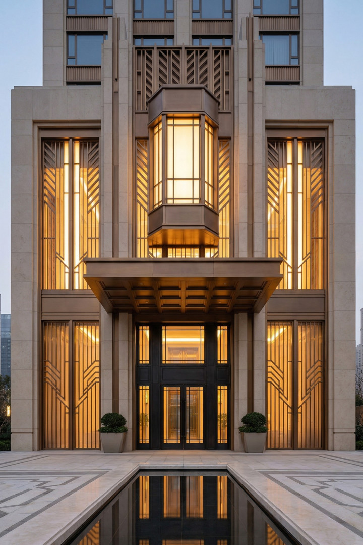 且随我一同品鉴我们独具现代装饰艺术风格的建筑外立面。其以简洁的装饰艺术线条、玻璃、金属与灯光为主要元素,将平凡的日常入口幻化为一场庄重的仪式。