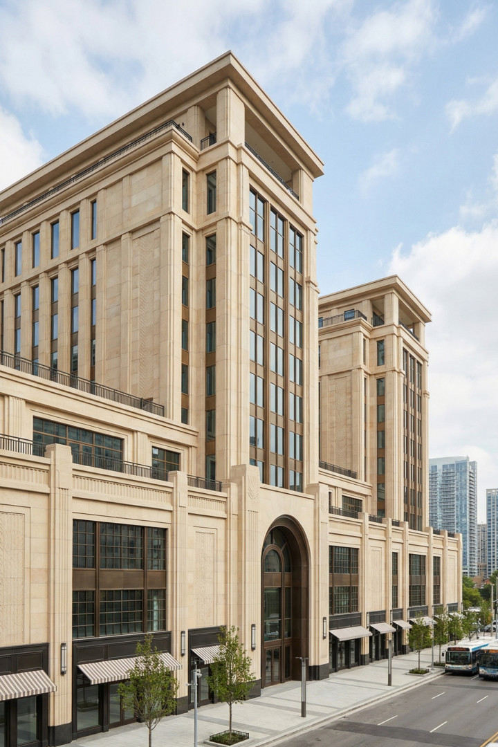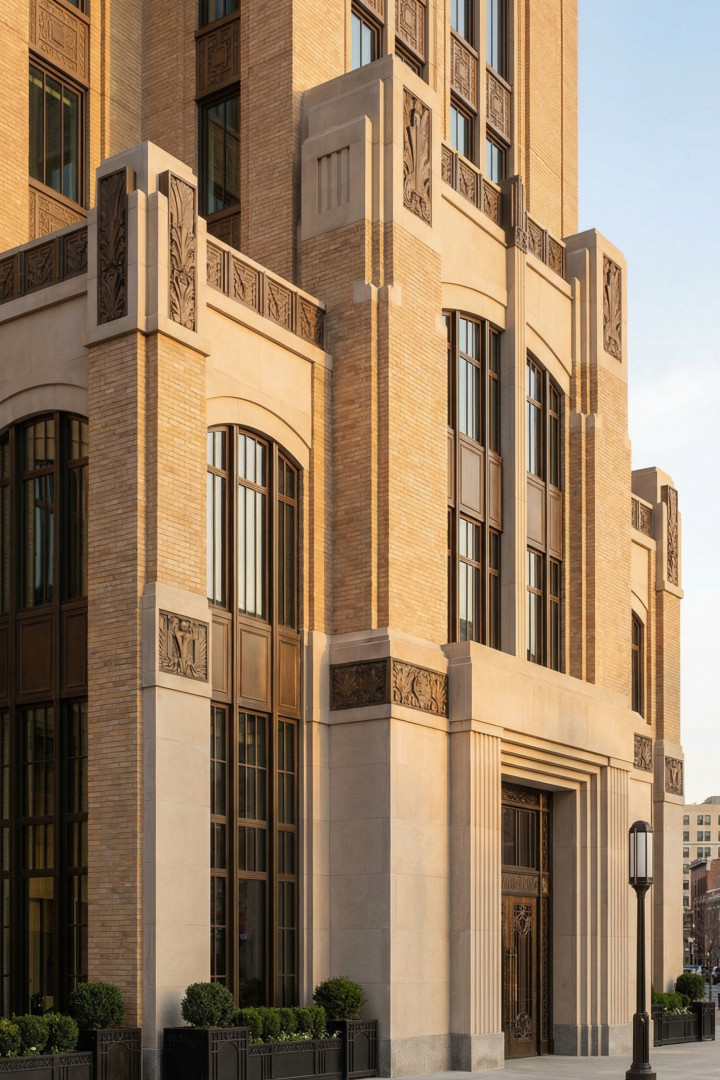 透过那扇扇窗户,你会发觉垂直的线条仿若灵动的指引者,不断牵引着你的视线向上攀升。而大块的玻璃网格、玻璃砖以及青铜框架的窗框,则将灿烂的日光巧妙拉回到人眼可及的尺度。太阳光芒、雕刻浮雕、钟楼以及闪耀的皇冠皆巧妙地融入其中。