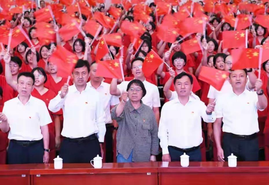 现场视频中,张桂梅着装朴素,拿着标志性的喇叭,在两位工作人员的搀扶下走进礼堂,女高学生们则身着红色T恤,手拿红旗。在阅兵开始前,张桂梅、女高师生及华坪县领导干部集体合唱《没有共产党就没有新中国》。
