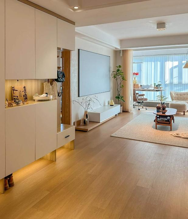 地面颜色不跳,和墙面、家具能自然衔接,看着不杂乱。